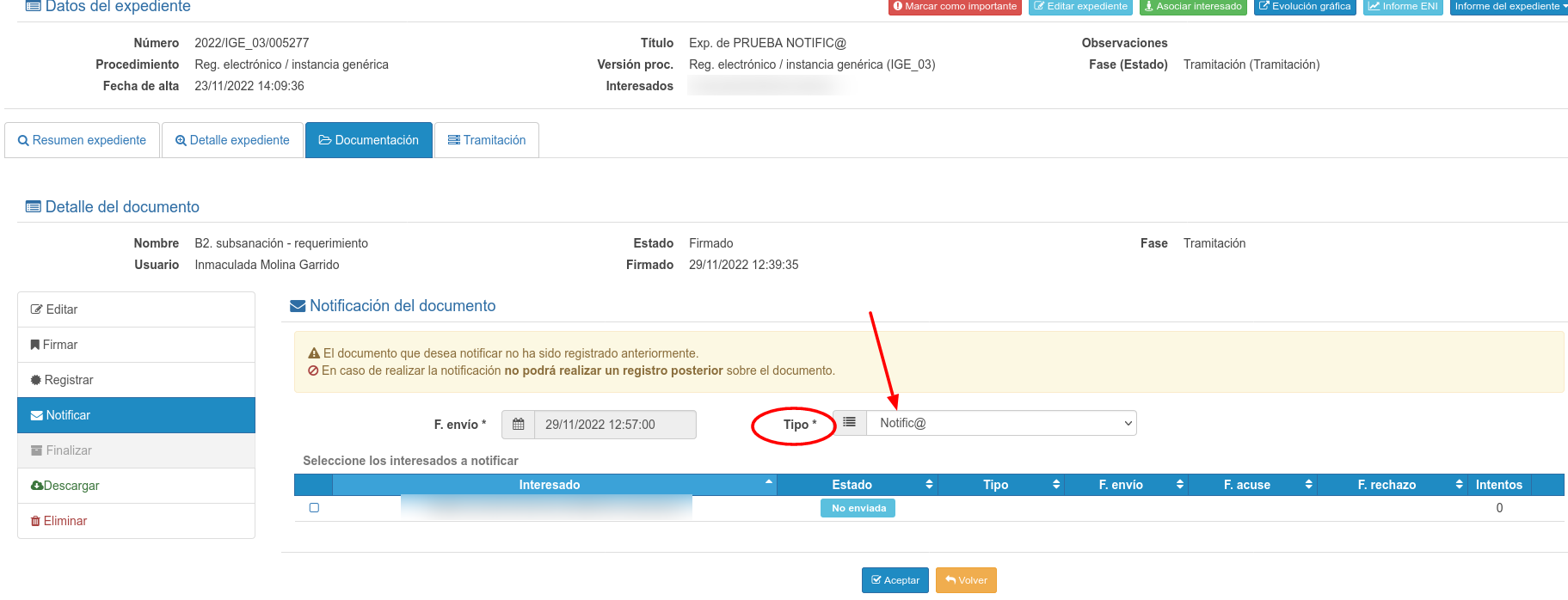 Se abrirá el detalle del documento, donde seleccionamos Notific@ (en Tipo), el interesado al que hay que notificar, y Aceptar